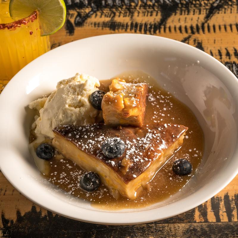 A warm, rich bread pudding baked with juicy peaches and a touch of cinnamon, topped with a decadent caramel sauce and fresh strawberries. Served with vanilla ice cream for the perfect sweet finish.