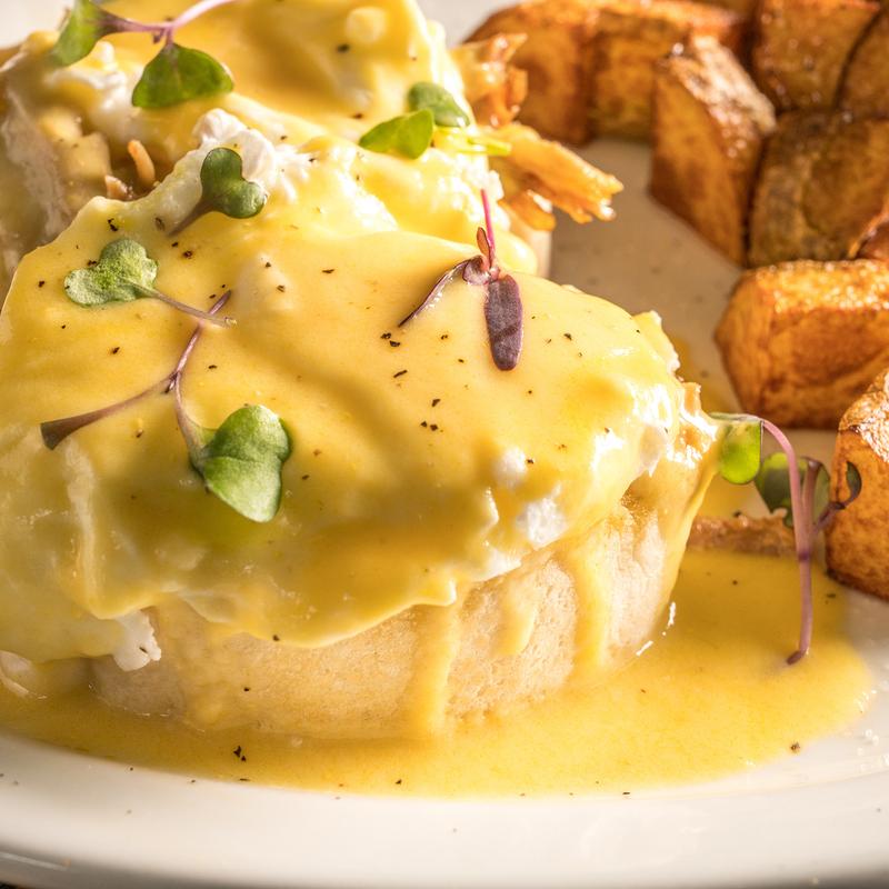 2 poached eggs, chipotle hollandaise, and green chile served over a buttery bolillo, accompanied by crispy potatoes.