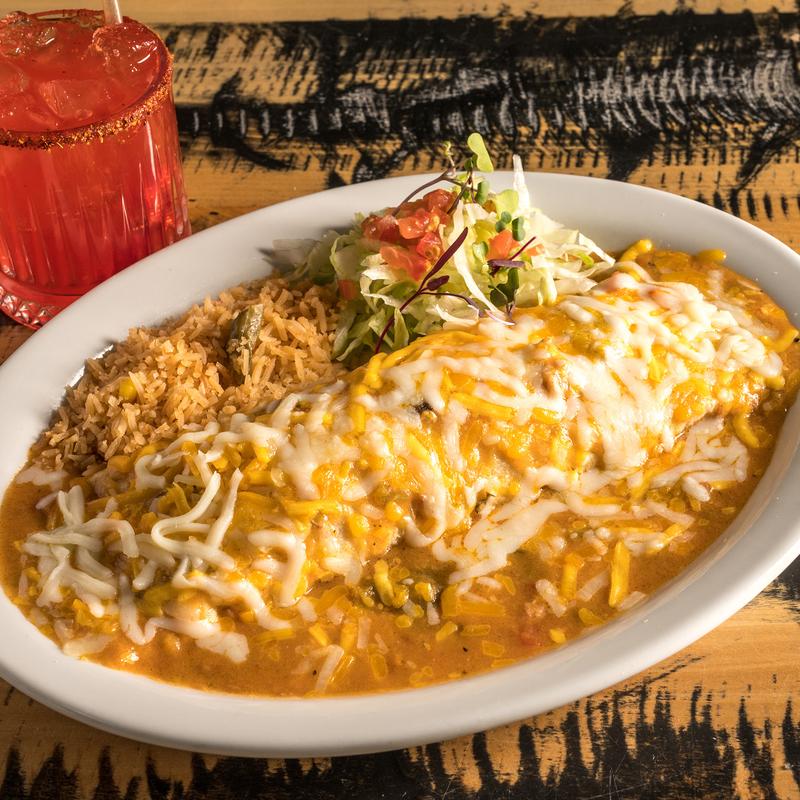 Hamburger patty wrapped in flour tortilla. Smothered in our homemade green chili. Topped with lettuce, tomato, & sour cream.