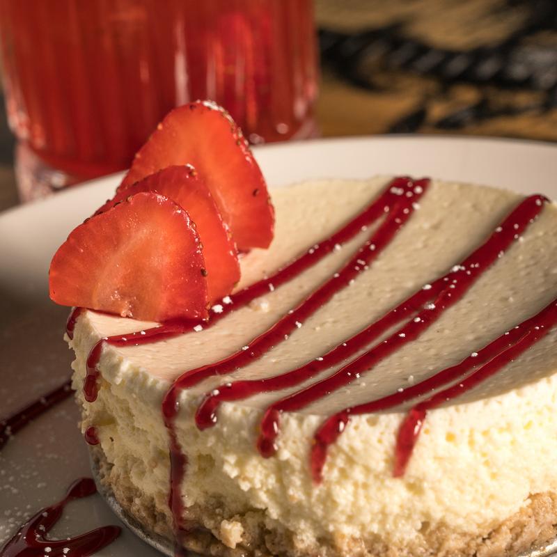 Our homemade creamy, velvety cheesecake on a buttery graham cracker crust, topped with fresh strawberries and a drizzle of strawberry sauce.